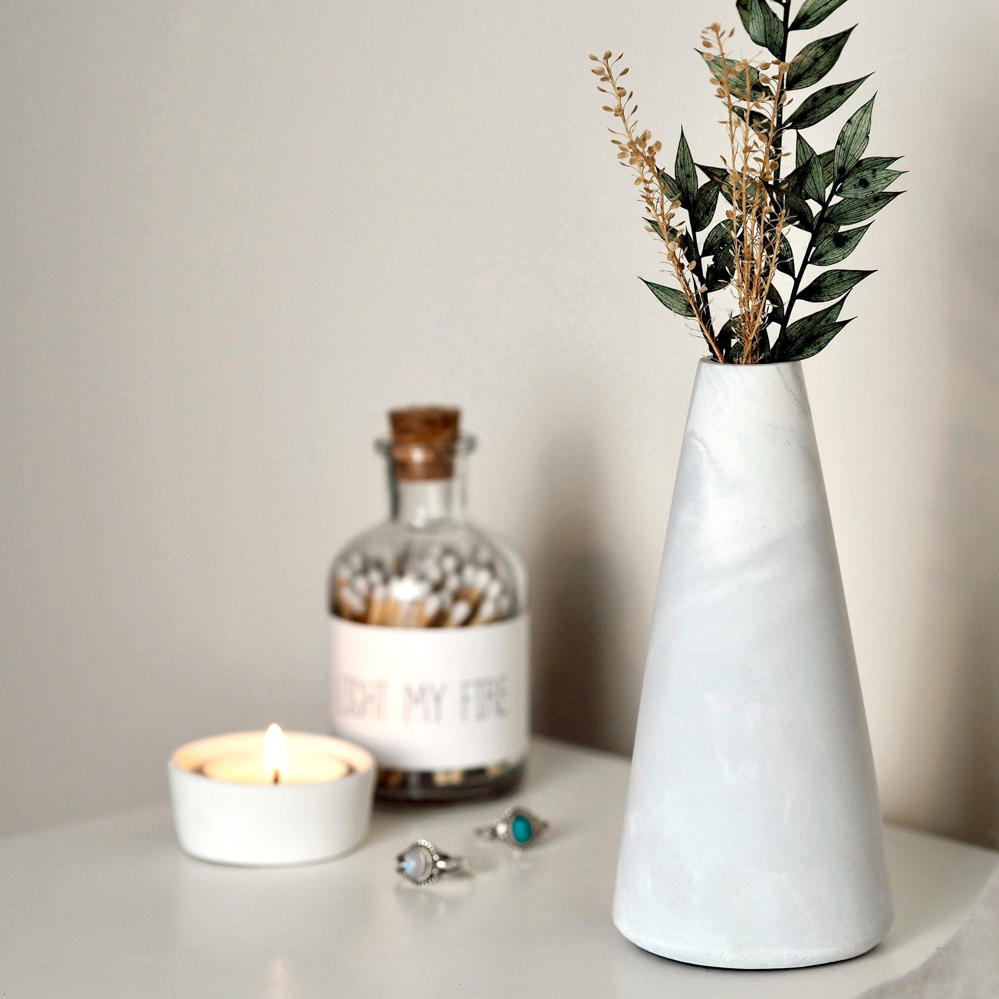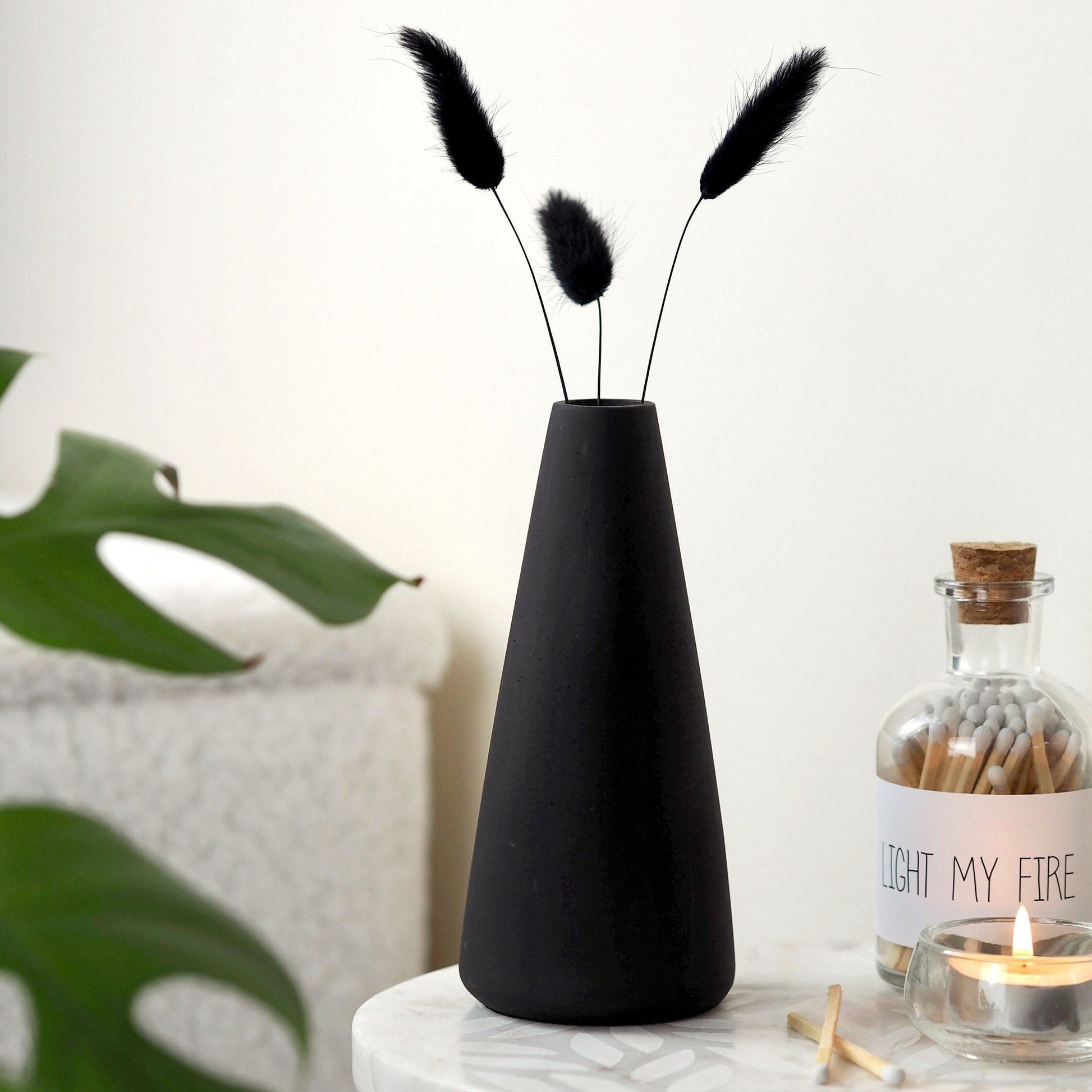 Add minimal style to your home with our tall Bud vase. Perfect for artificial and dried flower arrangements. The vase can be used to hold real flowers, but please do not fill with water.