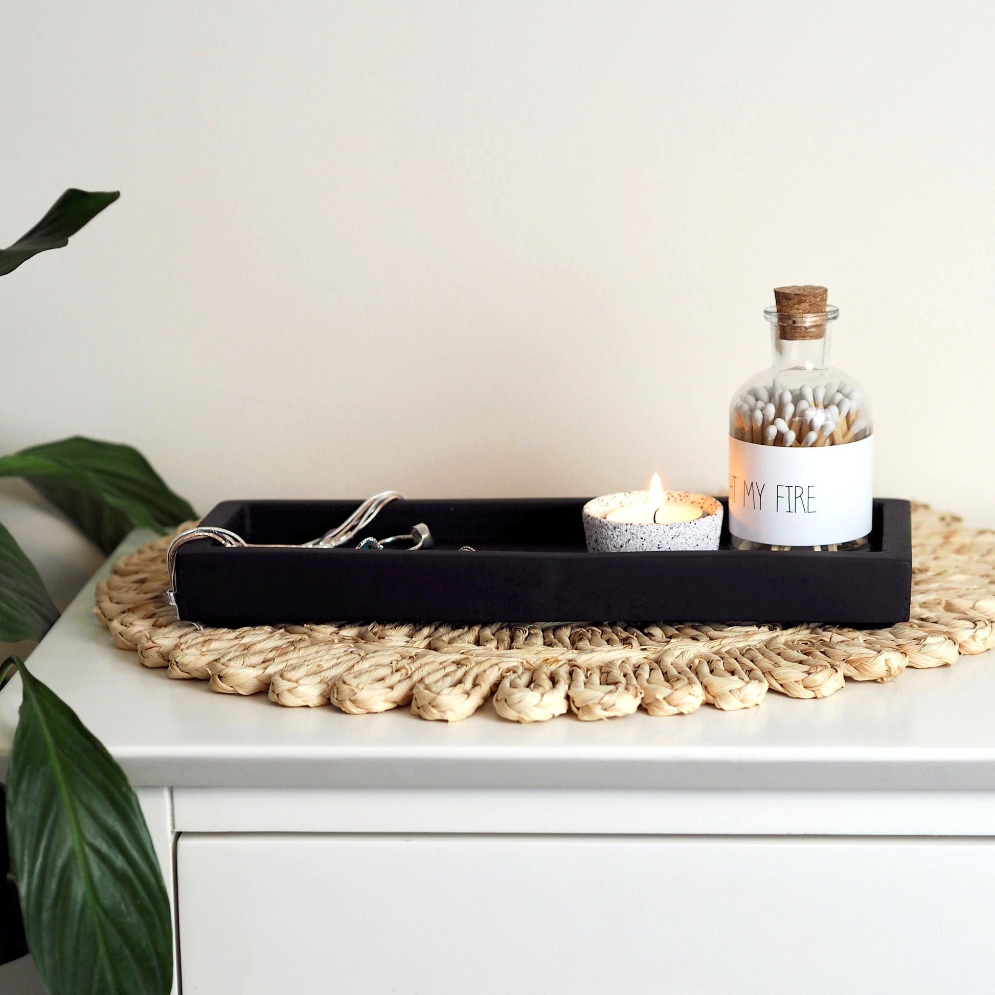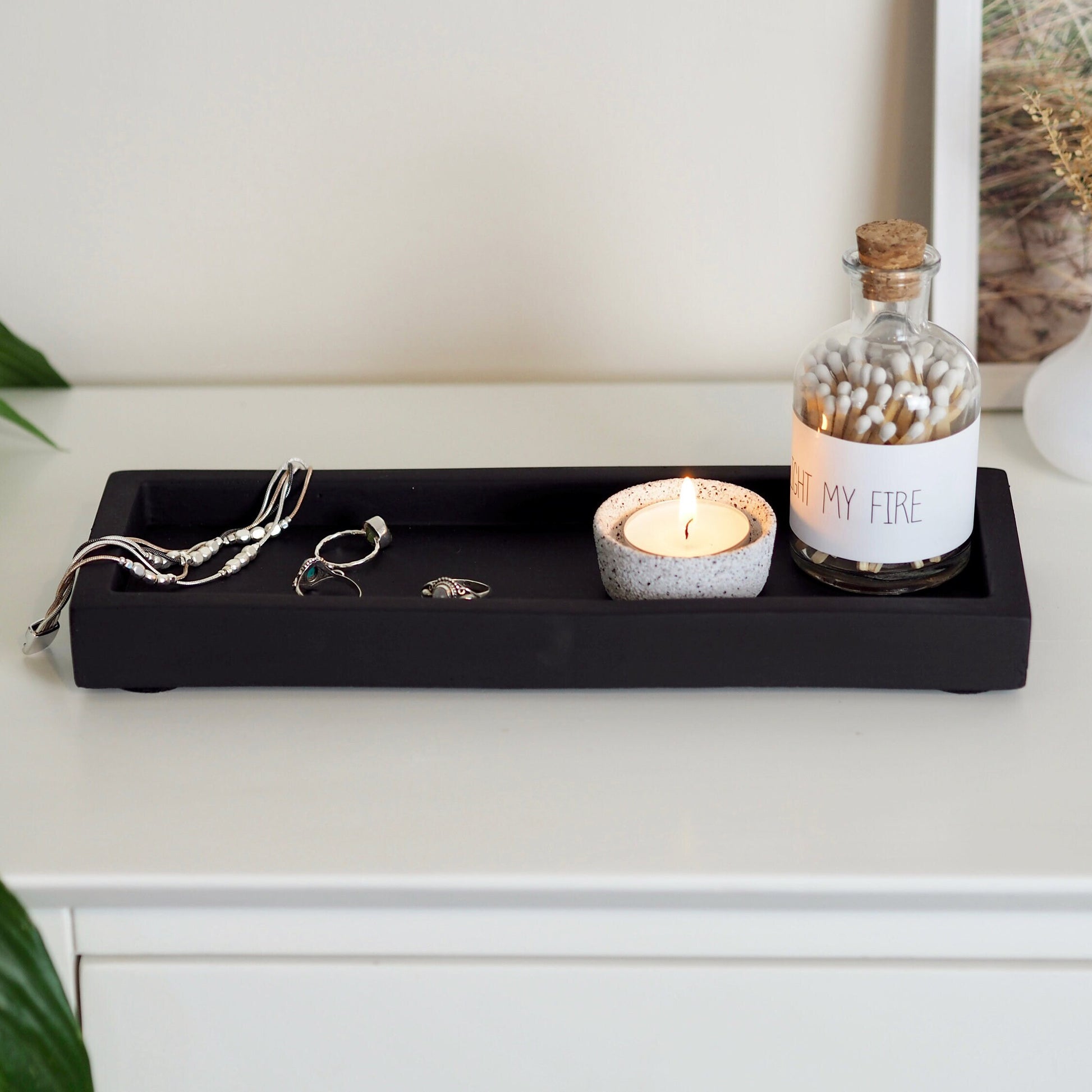 Versatile in its simplicity, our Black concrete Rectangle tray has a multitude of uses. Perfect in the kitchen, bathroom, bedroom, or living area, where it can be used to display reed diffusers, pillar candles, toiletries, and other decorative items.